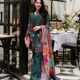 A symphony of intricate embroideries and luxurious textures. This ensemble is crafted in rich lush green hues that evoke pure elegance. The fabric a delicate blend of lawn and organza is adorned with masterfully detailed embellishments that exude opulence. Paired with a flowy, printed silk dupatta that drapes with graceful fluidity, the look is completed by chic lawnkari culottes that offer both comfort and refinement. This ensemble is the epitome of effortless sophistication, where timeless craftsmanship meets playful charm, creating a harmonious balance of luxury and contemporary allure.