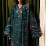 Unveil timeless sophistication with this exquisite bottle green luxury embroidered ensemble, crafted from premium lawn and organza for an opulent touch. The elegantly detailed khaddi net dupatta drapes effortlessly, while tailored cotton culotte add a modern yet graceful finish. A perfect fusion of refinement and effortless charm.