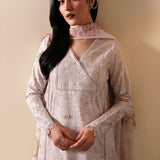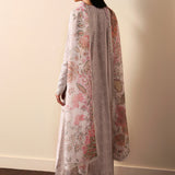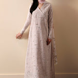 Step into understated sophistication – a digitally embroidered grey ensemble in premium lawn & organza, complemented by a fluid silk digital printed dupatta and effortlessly chic cotton culotte for a refined, modern allure