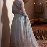Chandni is a harmonious mix of soft pastel pink and blue, adorned with delicate embroidery patterns and shimmering sequins on the bodice, sleeves and daman. A perfect blend of pastel hues and detailing, paired with shaded chiffon dupatta and tonal trousers.