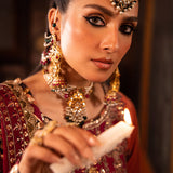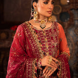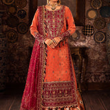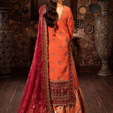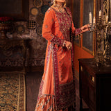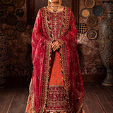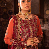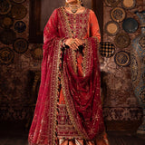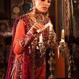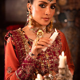 Infuse elegance into your attire with this coral number featuring a velvet long shirt adorned with two-toned champagne zari, copper cupped sequins, and light gold lurex. The embroidered neckline, sleeves, and back boast a beautiful infusion of deep purple, sage green, dull pink and mauve threadwork. The embroidered borders on sleeves, chaak, daaman and neckline add a regal touch with the inserts of Dull mauve on the borders seamlessly blend with the ensemble, creating a stunning contrast. The embroidered dupatta with its four-sided borders, completes this coral elegance, making it a graceful manifestation of mauve-infused beauty.