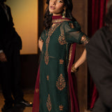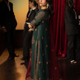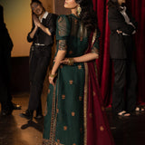 Steeped in the depth of dark green, this ensemble is a graceful nod to heritage. The shirt becomes a tapestry of tradition, adorned with time-honored motifs brought to life in antique gold zari and glimmering sequins. Accents of maroon and rust thread dance through the fabric like autumn leaves caught in a golden breeze, lending warmth and richness to every inch. Paired with a thoughtfully contrasting dupatta, embroidered in harmony with the outfit’s artistry, this look speaks of legacy dressed in elegance—perfect for those who carry culture with quiet pride.