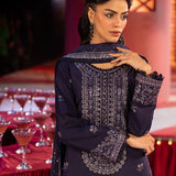 Bathed in the midnight charm of navy blue, this outfit exudes quiet sophistication. The shirt draws immediate attention to its exquisitely crafted neckline—an ornate masterpiece where two-toned antique silver zari meets shimmering silver sequins in a dance of dusk and moonlight. Subtle threadwork in greyish purple and navy blue hues glide across the fabric, creating a symphony of shadow and shimmer. Complemented by intricately embroidered trousers and a minimally embroidered dupatta, this ensemble is a harmonious blend of regal flair and modern artistry—perfect for evenings that demand a touch of grandeur.