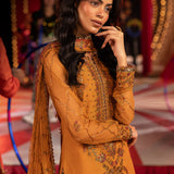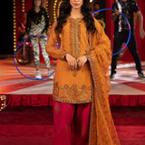 Perfect for a lively dholki or an exuberant mehndi night, this rust ensemble radiates joy with every thread. The shirt gleams with antique gold zari and copperish gold cupped sequins that catch the light like flickering diyas, while accents of magenta and leaf green threadwork add a festive flourish. The contrasting magenta trousers, adorned with embroidered motifs, bring a bold twist to the traditional palette. Finished with an artistically embroidered dupatta that ties the look together in a dance of color and craft, this ensemble is made to move with rhythm, laughter, and celebration.