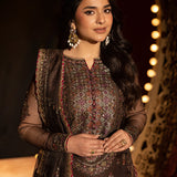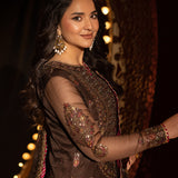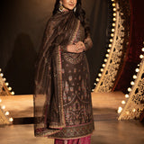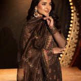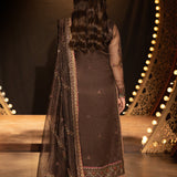 Rich and resplendent, this dark brown ensemble is a tapestry of earthy elegance and artistic finesse. The shirt is exquisitely embroidered with two-toned antique gold zari and shimmering light gold sequins, casting a warm, radiant glow. Threadwork in sage green, purple, rust, and deep beige hues flows across the fabric like a painter’s palette brushed with nature’s finest tones. The ensemble is thoughtfully paired with a floral-printed trouser in a contrasting hue, completed with an embroidered hem that adds a playful yet polished finish. A gorgeously embroidered dupatta ties the look together, echoing the ensemble’s intricate charm and creating a harmonious blend of allure and grace.