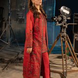 Merging timeless artistry with a contemporary flair, this red ensemble reimagines festive wear with striking originality. The cape, styled over a short shirt, channels vintage charm with a modern twist—its surface brought to life by intricate shikargah motifs embroidered in lustrous zari, radiant red sequins, and rich tones of navy blue, maroon, and red threadwork. Beneath it, the short shirt complements the grandeur with a finely detailed neckline and border that reflect the same ornate aesthetic. It's a powerful look that honors tradition while embracing bold, modern elegance.
