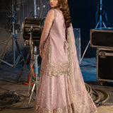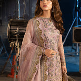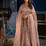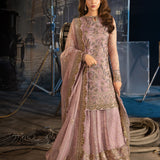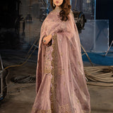This pale lilac outfit is a poetic tribute to timeless elegance. The heavily embroidered shirt is adorned with an all-over pattern that shimmers with the brilliance of two-toned antique gold zari, 5mm sequins, and 3mm light gold cupped sequins, each element catching the light like glints of dawn. Threadwork in soft lilac and beige hues adds a dreamy softness, enriching the design with quiet allure. It is paired with a beautifully crafted dhaka pajama, featuring a richly embroidered border and a subtle sequined spray that lends graceful movement to the silhouette. A minimally embroidered dupatta completes the ensemble, offering balance to this breathtaking harmony of tradition and refinement.