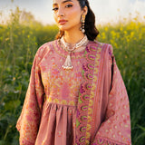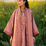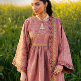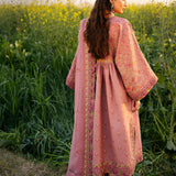 Like the gentle embrace of a spring sunrise, this desert rose ensemble radiates warmth and understated elegance. The exquisitely embroidered shirt showcases a stunning front bodice adorned with intricate threadwork in rust, orange, lilac, mint, leek green, and beige—each hue echoing the colors of a blooming meadow at dawn. Minimalistic motifs gracefully dance across the fabric, adding an air of effortless sophistication. Paired with an embroidered chiffon dupatta that drapes like a whispering breeze, this ensemble is a poetic fusion of nature’s elegance and timeless beauty.