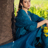 Exhibiting vibrant depths of an ocean, this tropical blue ensemble captures the bold beauty of nature’s most striking hues. The embroidered shirt, crafted with self-colored thread, showcases a unique boring technique that elevates the design, while architectural elements woven into the embroidery add an intriguing touch of structure. Paired with a beautifully embroidered dupatta, this ensemble becomes a harmonious blend of modern artistry and timeless elegance, evoking the powerful yet refined energy of nature’s wonders.