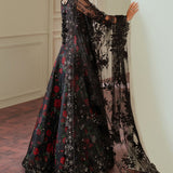 The net sleeves are embroidered with black threadwork enhanced by silver sequins. Moreover, the overall outfit has digital floral printed silk lining visible through the net creating a luxurious texture.