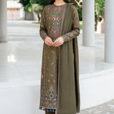 This ensemble radiates earthy charm with its embroidered slub khaddar front and side panels complemented by front and back borders. Sleeves are also adorned with matching embroidery, paired with a dyed viscose twill shawl with borders, and a simple dyed slub khaddar trouser and back.