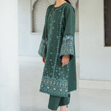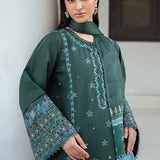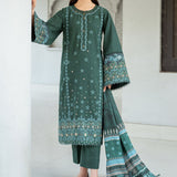 This outfit includes an embroidered slub khaddar front with additional borders enhancing the sleeves and back. A digital printed viscose twill shawl adds a dash of vibrant patterns, completed with a dyed slub khaddar trouser.
