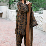 Featuring a digital printed viscose silk shirt and trouser set complemented by an embroidered neckline and sleeves border. The ensemble is paired with a digital printed viscose twill shawl and matching printed shalwar.