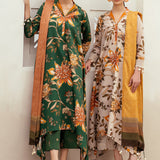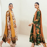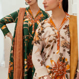 The ensemble offers a harmonious blend of autumnal hues and refined textures. Featuring a digital printed slub khaddar shirt and trouser that unfold in a canvas of rich floral and foliage motifs. Complementing the vibrant base are the delicate schiffli sleeves borders. A digital printed twill shawl completes the set, draped in complementary colors that echo the earthy tones of the outfit, perfect for seasonal transitions.