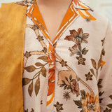 The ensemble offers a harmonious blend of autumnal hues and refined textures. Featuring a digital printed slub khaddar shirt and trouser that unfold in a canvas of rich floral and foliage motifs. Complementing the vibrant base are the delicate schiffli sleeves borders. A digital printed twill shawl completes the set, draped in complementary colors that echo the earthy tones of the outfit, perfect for seasonal transitions.