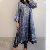 This set offers a captivating blue printed lawn shirt complemented by embroidered neckline and sleeves borders. The digital printed lawn trouser and silk dupatta add layers of texture and print, ideal for versatile styling.