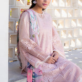 This soft pink set blends subtlety and charm with its embroidered lawn front and schiffli details at the neck and sleeves. The ensemble is completed with a digital printed silk dupatta and dyed cotton trouser, making it perfect for light events.