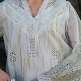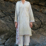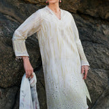 This set blends subtlety and charm with its embroidered lawn front and schiffli details at the neck and sleeves. The ensemble is completed with a digital printed silk dupatta and printed lawn trouser, making it perfect for light events.