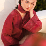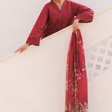 This design revolves around rich embroidery on a lawn, with intricate details on the front and sleeves. The back is dyed in a solid color to balance the ornateness of the front. Schiffli adorn the neckline and front border, while a digital printed chiffon dupatta completes the ensemble with grace.