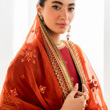 This exquisite 3-piece ensemble features a chiffon shirt adorned with intricate embroidered tilla motifs at the front and back. The shirt is enhanced by a finely crafted silk neckline and embroidered sleeves borders. The look is completed with a chiffon dupatta, adorned with organza side borders, and paired with a sleek dyed silk trouser.