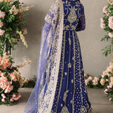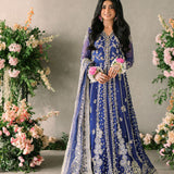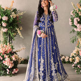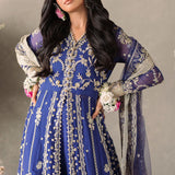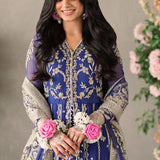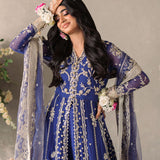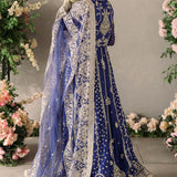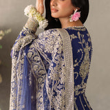 "Sehar" an exquisite creation in a captivating shade of blue. Crafted from luxurious chiffon, this hand-embellished ensemble features intricate detailing that adds a touch of opulence to its refined silhouette. The delicate embellishments shimmer and create a mesmerizing effect that's perfect for any special occasion. The look is complete with an embroidered and sequined net dupatta and silk trouser.