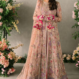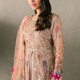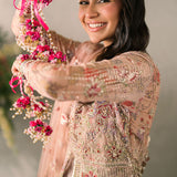 Our ensemble Sona offers a stunning blend of sophistication and glamour. Crafted from printed chiffon with intricate hand-embellished details, it exudes timeless elegance. The ensemble is complemented by a net dupatta, adorned with exquisite embroidery and sequins, adding a touch of dazzling refinement to your look.