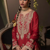 Divinely gorgeous, ‘Crimson’ is a beauty like no other. Team Shurooq has outdone itself with this red number. Absolutely stunning gold tilla embroideries with resham thread work add life to the silk shirt and trouser. Hand applied sitara, pearls and stone beading bring opulence to the ensemble paired together with a delicate block printed organza dupatta.