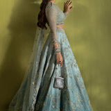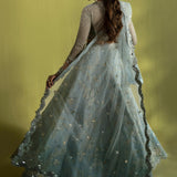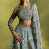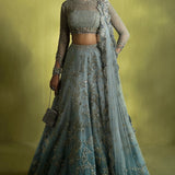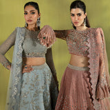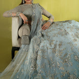 Enigmatic and enchanting, Élan’s luxury prêt-à-porter captivates with its ethereal romance and celestial elegance. The Cristal d’Aube ensemble in an exquisite shade of ice blue radiates sophistication, crafted from sumptuous fabrics in delicate, airy hues. Adorned with intricate hand embellishments, radiant pearls, and dazzling Swarovski crystals, each detail is a testament to refined artistry. Quintessential Élan tassel accents complete this breathtaking creation, making it an ideal choice for upcoming wedding festivities where elegance and opulence are paramount.