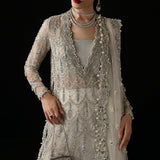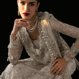 Immerse yourself in unparalleled opulence with Lumière de Neige—a breathtaking masterpiece adorned in a symphony of radiant crystals, lustrous pearls, and intricately crafted cutdana. This ensemble reveals a refined, elongated silhouette, with a shirt that is impeccably tailored to evoke an aura of regal grandeur. Paired with flawlessly sculpted trousers and a shimmering bustier, Lumière de Neige exudes an ethereal elegance, encapsulating the very essence of luxury and haute couture. Every meticulously curated detail of this silhouette speaks to an unmatched level of sophistication, commanding attention and captivating all who behold it. Lumière de Neige is the epitome of timeless allure—an unparalleled statement of high fashion