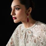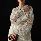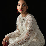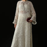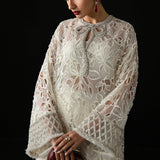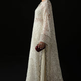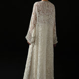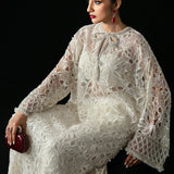 Voile d'Argent—a breathtaking vision of celestial pearl sophistication. This ethereal creation merges modern allure with timeless luxury, crafted from lustrous organza layered over delicate netting, and adorned with a striking floral laser-cut detail that adds captivating drama to its silhouette. A crystal-embellished bow neckline graces the design, imbuing it with an air of refined opulence. Each cascading layer catches the light in a soft, mesmerizing shimmer, enhancing the gown's graceful flow. Paired with tonal pleated pants, Voile d'Argent is the epitome of understated glamour—ideal for an evening steeped in elegance or any occasion demanding true opulence.