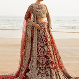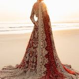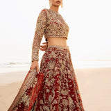 The "Adoree" dress is a stunning lehenga and choli ensemble, featuring intricate floral patterns crafted with 3D flowers and golden sequins. The lehenga's hemline is adorned with a geometric border and a heavy border at the end for added opulence. The choli dazzles with golden pearls, tilla, and signature cora dubka, creating a striking contrast against the rich fabric textures. With a tulle inner lining and raw silk fusion for comfort, the lehenga€™s voluminous silhouette is enhanced by a cancan. The look is completed with a beautifully beaded dupatta, featuring an elegant border for a refined finish.