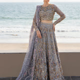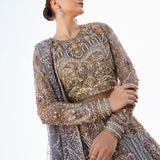 This exquisite dress features a delicate repeated motif border, adding an elegant frame to the design. The circle-shaped neckline enhances the timeless appeal, while the intricate 3D floral embellishments bring a touch of sophistication. Adorned with a stunning mix of golden and silver sequins, tilla, pearls, cut moti, Cora, dabka, and golden crystals, the dress showcases a luxurious interplay of textures and rich details. The floral work is meticulously crafted, with small tassels on the dupatta pallu adding a playful yet refined finish. The ethereal tulle fabric complements the intricate embellishments, creating a perfect balance of grace and glamour.