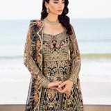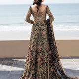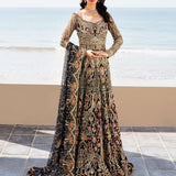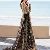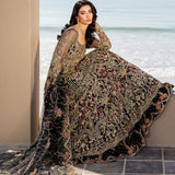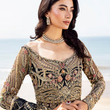 This luxurious dress features a dark fabric adorned with intricate red and green floral embroidery, enhanced by vibrant floral sequins, golden leaf-shaped sequins, and sparkling crystals. Pink 3D flowers create a striking contrast, while a black tulle overlay adds texture. The bodice boasts a sophisticated boat neckline, decorated with pearls, crystal sequins, and beads, complemented by champagne-colored pearls. The overall design combines classic luxury with modern vibrancy, creating an opulent and intricately detailed garment.