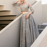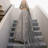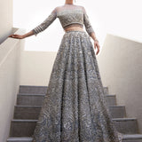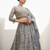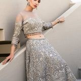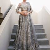 This exquisite dress is a masterpiece, featuring intricate white pearls, Naskhi, Cora, and dabka work that add depth and texture. Delicate silver sequins and champagne pearls enhance its elegance, while bathki embroidery adds timeless appeal. Silver-golden cut moti and tilla work create a mesmerizing, ethereal effect. The playful tassels at the sleeves and the voluminous cancan beneath the lehenga ensure a graceful silhouette, all crafted from luxurious tulle fabric.