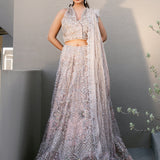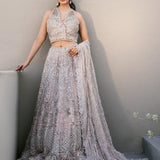 This stunning dress features a mesmerizing blend of silver sequins, intricate 3D flowers, and delicate machine embroidery, all meticulously hand-embellished with white beads, cut motis, and golden cut motis. The design is set against a luxurious tulle fabric, adding a soft, ethereal touch. The halter neck design beautifully frames the neckline, while the elaborate embellishments create a shimmering, elegant effect, making this dress a true statement piece.