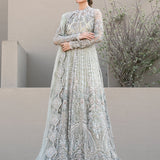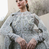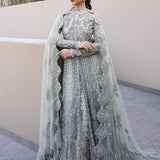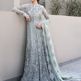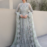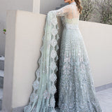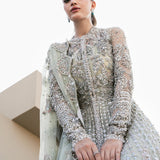This exquisite 3-piece bridal outfit in ice mint green features a flowing, ruffled tulle dress that moves with grace. The open gown is lavishly adorned with intricate kora dabka embroidery, shimmering pearls, radiant crystals, and sequins, creating a regal and captivating look. The gown's crystal detailing adds a mesmerizing sparkle, ensuring the bride shines on her special day.