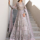 The Lavande pishwas is a stunning creation featuring a blend of silver and antique silver embroidery, adorned with lilac crystals, pearls, and intricate embellishments. The wrist area is richly decorated with sequins, crystals, and pearls, while the neckline showcases modern geometric designs with silver sequins, cut beads, and Japanese leaf sequins. Floral elements are scattered across the fabric, with scalp details adding a refined touch. Paired with a plain shimmery lehenga and a dupatta lined with sequins, pearls, and tassels, it exudes luxury and grace, perfect for a bride seeking elegance on her special day