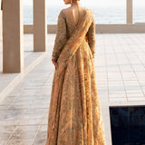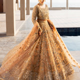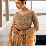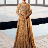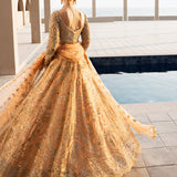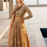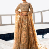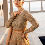 The Lumiere bridal ensemble blends antique elegance with intricate craftsmanship. The delicate antique peach lehenga and choli feature golden embroidery, enhanced with beads for depth and texture. The choli showcases a botanical design with detailed silver threadwork, tilla, and risham, celebrating nature's beauty. Gold tassel-adorned sleeves and buttoned wrists add sophistication, while crystal tassels on the choli provide a subtle shimmer, elevating the luxurious overall look
