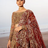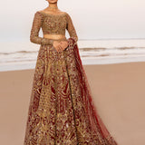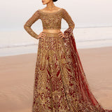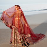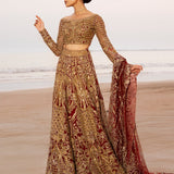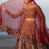 The bridal gown is a timeless masterpiece, featuring intricate golden embroidery, golden pearls, sequins, and Japanese cut golden beads for a sparkling effect. Antique details and sequin-embellished lines enhance its captivating beauty, while the wide boat neck offers a sophisticated silhouette. Accompanied by a regal veil and dupatta, the gown is completed with a cancan beneath the lehenga for added volume and structure, creating a luxurious, full-bodied look.