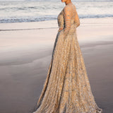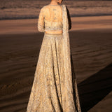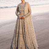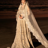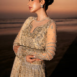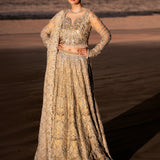 This dress in golden and champagne tones is adorned with intricate 3D floral elements, beads, pearls, and shimmering crystals, creating an opulent look. The silver and antique dabkha metal work adds a traditional touch, while the crystal-embroidered tulle sleeves offer elegance. A silver zipper provides modern functionality, and the ensemble is completed with a veil and dupatta, featuring detailed scalp work with pearls, sequins, and golden crystal accents.