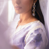 A beautifully botanical-printed short kameez and shalwar. The kameez showcases elegant embroidery and is enhanced with an additional layer of gradient organza, adding an exquisite touch. The shalwar is designed with a bordered end for a refined finish. Complementing the outfit is a gradient organza dupatta, completing the look with grace and sophistication.