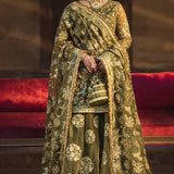 An enchanting ensemble that captures the sophistication of premium vintage fashion. The centerpiece is a mehndi green organza short shirt, adorned with intricate jali embroidery patterns and delicate gota hand embellishments. Paired seamlessly with a matching mehndi green organza sharara, embellished with exquisite boti work, this ensemble radiates graceful charm and vintage allure. Completing the look is a mehndi green organza dupatta, featuring beautifully embroidered jali patterns inspired by royal vintage aesthetics, and accentuated with a four-sided kiran border. This touch of regal opulence infuses the ensemble with understated grandeur, making it a perfect blend of historical elegance and modern sophistication.