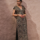 This enchanting creation features a long-slit kaftan with an exquisite neckline, combining effortlessly combines elegance and glamour, captivating all who lay eyes upon its unique design and vogue cuts.