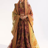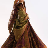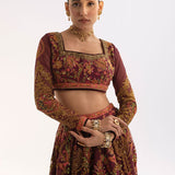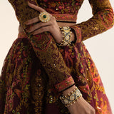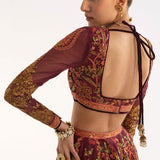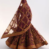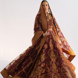 Wine lehenga, boastinga voluminous flare anda wide border that commands attention. Crafted with double organza lining, the ensemble featuresa net choli that shimmers with embellishments on the neckline.The net sleeves are adorned with a bold motif running from wrist to shoulder, while the dupatta is embroidered and finished witha wide border that frames the look perfectly. A true showstopper for those who want to makea grand entrance.
