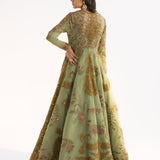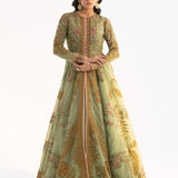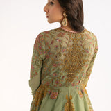 This sage jacket radiates refined elegance, featuring delicate embellishments along the neckline and a row of button loops for a classic touch. The sleeves are finished with a bold border at the wrists, adding a bit of drama to the look. Paired with a flowing silk flared lehenga that boasts a wide border and a fitted inner corset, this outfit combines structure with movement. A net dupatta with intricate multi-head embroidery and a wide border completes the ensemble, offering a perfect blend of modern sophistication and timeless charm.
