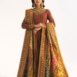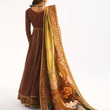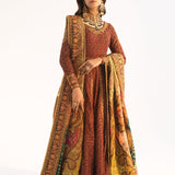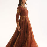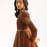 This maroon Anarkali frock exudes soft elegance and charm. The round neckline is delicately embellished, adding a subtle sparkle, while bold borders on the sleeves and hem make a refined statement. The frock has an airy organza lining, layered over a fitted silk corset inner for a perfect silhouette. It's paired with a flowing silk lehenga featuring a stylish border for added depth. The net dupatta completes the look with a detailed border and embroidered floral accents, giving the ensemble a fresh, modern appeal.