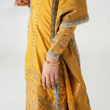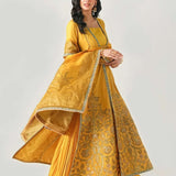 The front open kameez features long sleeves. It is heavily embellished with intricate gold embroidery, particularly around the hem. A contrasting border at the edge a mustard boarder in between panels. The outfit includes a banarsi dupatta in the same mustard yellow hue, also adorned with a matching embroidered border. The sharara pants with the banarsi border at the hem. The overall look exudes a festive and celebratory vibe