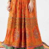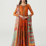 A vibrant, long-sleeved orange dress embellished with intricate embroidery on net with under dress in printed lawn. The dress has a flowing, Anarkali silhouette. Paired with silk printed dupatta featuring a complex paisley pattern in shades of green, pink, yellow, and blue, with embroidered and banarsi borders. The bottoms are in plain lawn finished with banarsi border perfect for festive occasions.