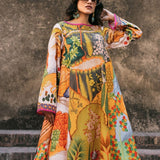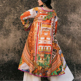A luxurious lawn drape shirt, crafted from premium-quality fabric and adorned with intricate digital printing, drawing inspiration from Mughal miniature elements in elegant, refined hues.