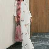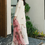 Crafted from luxurious embroidered Korean silk, this ensemble features flowy flared pants or effortless grace. A statement printed dupatta adds a contemporary touch, making it perfect for any occasion-because elegance never goes out of style.